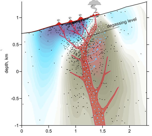 Interpretazione dei risultati tomografici basata sulle anomalie di Vs, Vp e Vp/Vs. L’immagine mostra il condotto che collega le parti più profonde con quelle più superficiali. Intorno a 0,7 km di profondità si trova il livello di degassamento, riconoscibile dal contatto tra valori alti e bassi del rapporto Vp/Vs. Più in superficie, i fluidi si separano in due percorsi: quelli ricchi di gas risalgono fino alla superficie, dando origine alle fumarole, quelli ricchi di lava attraversano le zone con basso Vp/Vs, da cui effettivamente viene emessa la maggior parte della lava.