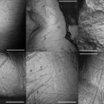- Strie di microusura in 3 denti di Palaeoloxodon falconeri – sopra – e 3 di Palaeoloxodon mnaidriensis – sotto –