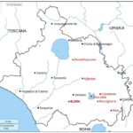 - Mappa della Tuscia. Il punto rosso indica la posizione del sito raffigurato nel dipinto. Nelle vicinanze: Viterbo, Nepi, Ronciglione, Montefiascone, Caprarola, paesi visitati da Turner nel 1828, lo stesso anno in cui fu realizzato il dipinto.