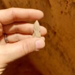 - Una punta di freccia “El Khiam” scoperta a Jebel Arnaan, in Arabia Saudita. Questo tipo di strumento è ben noto nei siti dell’Olocene inferiore nel Levante, evidenziando collegamenti a lunga distanza. Credito: Progetto di arte rupestre e archeologia di Sahout