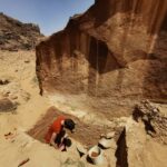 - Trincea 1 a Jebel Arnaan, situata sotto un pannello di arte rupestre. Gli scavi qui hanno portato alla luce uno strumento di incisione risalente a 12.000 anni fa. Credito: Progetto di arte rupestre e archeologia di Sahout