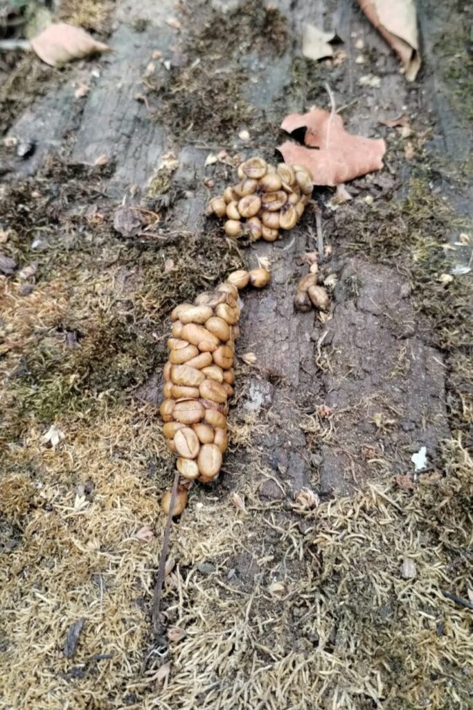 Escrementi, della civetta delle palme asiatica, fotografate in situ prima della raccolta da parte degli autori. Crediti: Ramit Mitra.