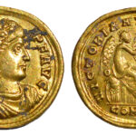 - Una delle tre monete d’oro portate alla luce con gli scavi del 2025: solido di Valente (367-375 d.C.), coniato nella zecca di Costantinopoli.
