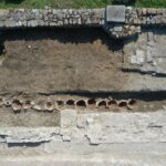 Infine, nell’area del complesso commerciale, ma anche fra le due cinte murarie già indagate negli anni scorsi, si sono messe in luce evidenze che ci parlano della frequentazione dell’area dopo l’abbandono del mercato. Si tratta di resti di strutture abitative dotate di focolari, di vani produttivi e di una strada più tarda che continuò a correre sul tracciato della precedente, confermando che la vita qui è continuata anche dopo la distruzione del grande complesso commerciale. Inoltre, il rinvenimento di alcune sepolture di inumati, prive di corredo, su cui sono in corso analisi al C14 per le datazioni, testimonia ancora una volta la lunga frequentazione dell’area.